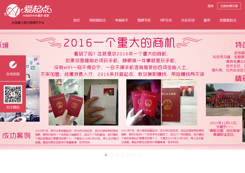 爱起点高端婚恋平台,于2014年10月正式上线,是广州铭爱信息技术有限公司的官方网站,全国最大面对面婚恋平台之一。 爱起点高端婚恋平台专业为广大单身人士提供高端婚恋介绍服务,涵盖白领征婚、高端猎婚、婚恋咨询、情感咨询、制定征婚方案以及线下联谊活动安排等。